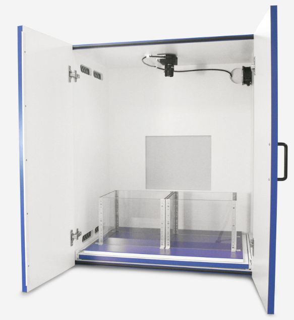 は高い防音室の天井に取り付けられたビデオカメラ (カメラは付属していません)と、暗闇でのビデオ録画のためのNIR照明が装備できます。引き出し式の青いベースプレートは動物の交換やケージの清掃時に大変便利です。さまざまな色のげっ歯類を追跡できます、SACは28V対応のDCファンとカメラマウントを備えています。